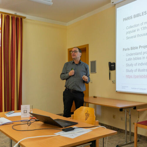 The second day opened with Silvia Miksch's welcome and an invited talk by Gerik Scheuermann from the University of Leipzig. His presentation on "Distant Viewing of Medieval Bibles - Towards Computational Iconography" offered fascinating perspectives on applying computational methods to historical visual analysis, sparking lively discussion about methodological approaches across different heritage domains.